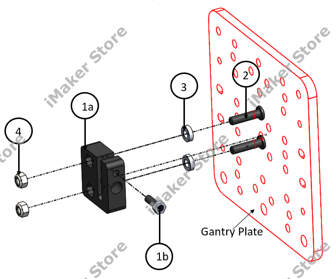 Preventing backlash in the leadscrew movement is easy with the anti-backlash nut. Follow the instructions in the drawing to attach the nut to the gantry plate. To ensure that backlash is prevented, make sure the setscrew (1b) is securely tightened.
