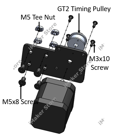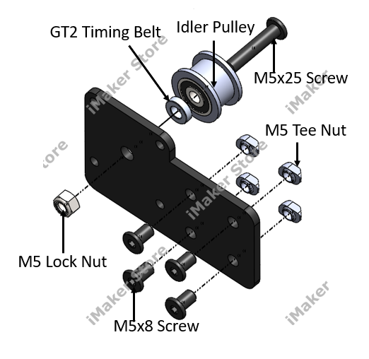 It is easy to assemble the M5x8 screws and M5 tee nuts on the plate. However, do not tighten them as these are used for fixing the sub-assembly to the V-slot rail. The M5x25mm screw and M5 nylon lock nut are part of the Idler Pulley Wheel Kit.