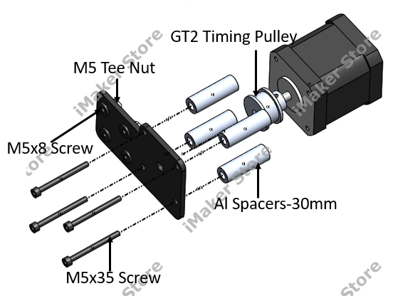 Insert M5x8 screws and M5 tee nuts on the plate. However, do not tighten them as these are used for fixing the sub-assembly to the V-slot rail. Use M3x10 Button head screws for the motor assembly of configuration-1. Use the Aluminum Spacers – 30mm, and M3x35 Button head screws for the motor assembly of configuration-2.