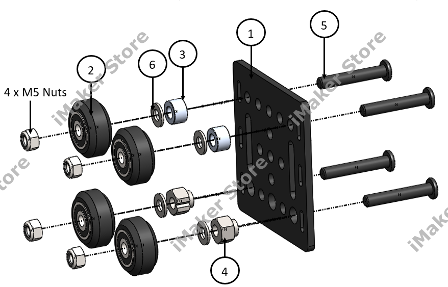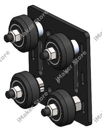 - Place the Aluminum spacers and eccentric spacers as shown in the drawing, making sure the rim of the eccentric spacer is properly inserted into the larger hole of the plate. This will allow the Cam mechanism to adjust the wheels' position when inserting the gantry bundle into the V-slot.